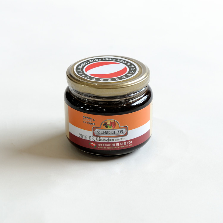 향산화효과가 뛰어난 C3G(cyanidine-3-glucoside;anthocyanin)를 풍부하게 함유한 복분자,오미자를 전통식으로 만들어진 조청에 혼합하여 만든 제품으로 색이 아릅답고 맛이 뛰어납니다.